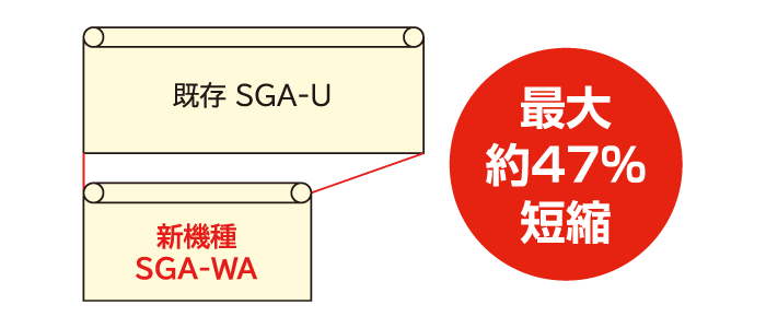 搬送ローラの配置を再検証し、従来機種(SGA-U)に比べて機長を最大約47%短縮。限られた工場スペースでも効率的に導入でき、レイアウトの自由度が大幅に向上します。