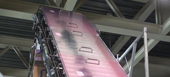事例1:<ベルト搬送>金属部品の急傾斜を省スペースでクリア