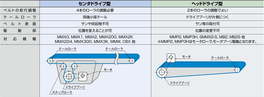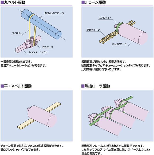 | 搬送物種類 | 不定形・小物・粒状・薄物に強い (面接触で保持) | 箱・通い箱・トレイ・パレットに最適 (線接触で転がす) |
