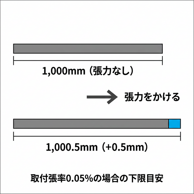 具体的には、ベルトメーカーの規定が「最小取付張率:0.05%」を示している場合はベルト全長1,000mmあたり約0.5mm程度の伸び量(下限目安)に相当します。ただし、この数値どおりに厳密な調整を行うことを求めるものではありません。