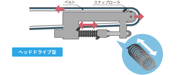 バネ(スプリング)の反発力を利用して、ベルトの張力を維持・補正する方式です。バネがベルトの初期伸びや一時的な伸縮をしなやかに吸収するため、日常的な調整の手間を大幅に削減できます。また、張力を一定に保つことでベルトが外力の影響を受けにくくなり、蛇行の抑制にも大きな効果を発揮します。中小型のコンベヤを中心に、メンテナンスの省力化や安定稼働(蛇行防止)を優先したい現場で広く導入されています。