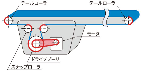 ベルトが左右いずれかに偏って走行する現象を「蛇行」といいます。蛇行が発生すると、ベルトがフレームやローラに接触し、異音や振動の原因となります。テンションの不均衡やローラの平行ずれ、搬送物の偏りが主な要因です。