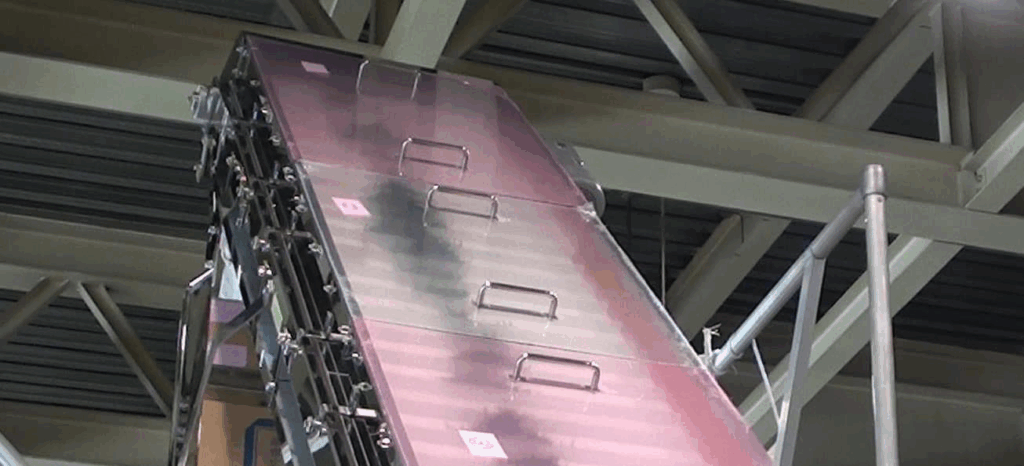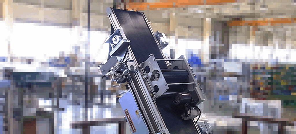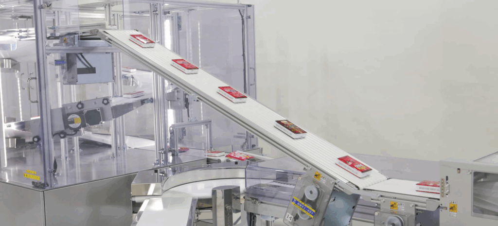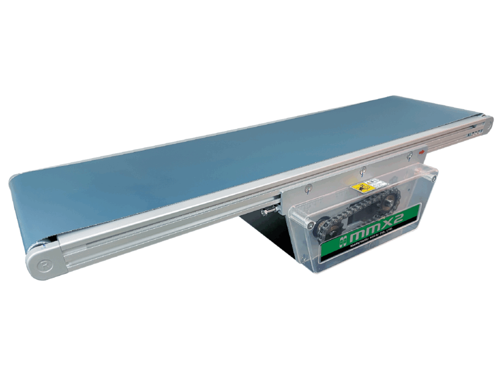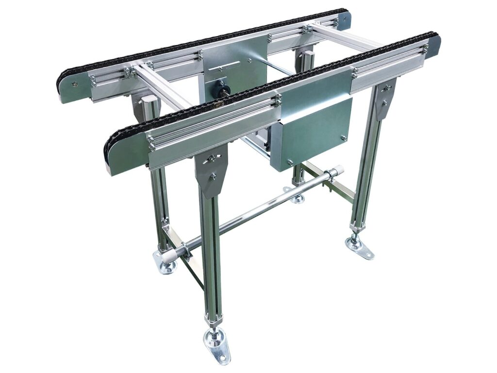 高低差のあるラインを繋ぐ傾斜構成では、ベルトとワークの摩擦条件に加え、フライトの有無や寸法、ピッチなどの仕様が、対応可能な傾斜角度に影響します。傾斜が大きく、搬送物の滑りや落下が懸念される場合には、搬送物が金属であればマグネットベルトを用いたり、搬送物を上下から保持する挟み込み搬送を採用したりすることで、より急な角度でも安定した搬送が可能です。