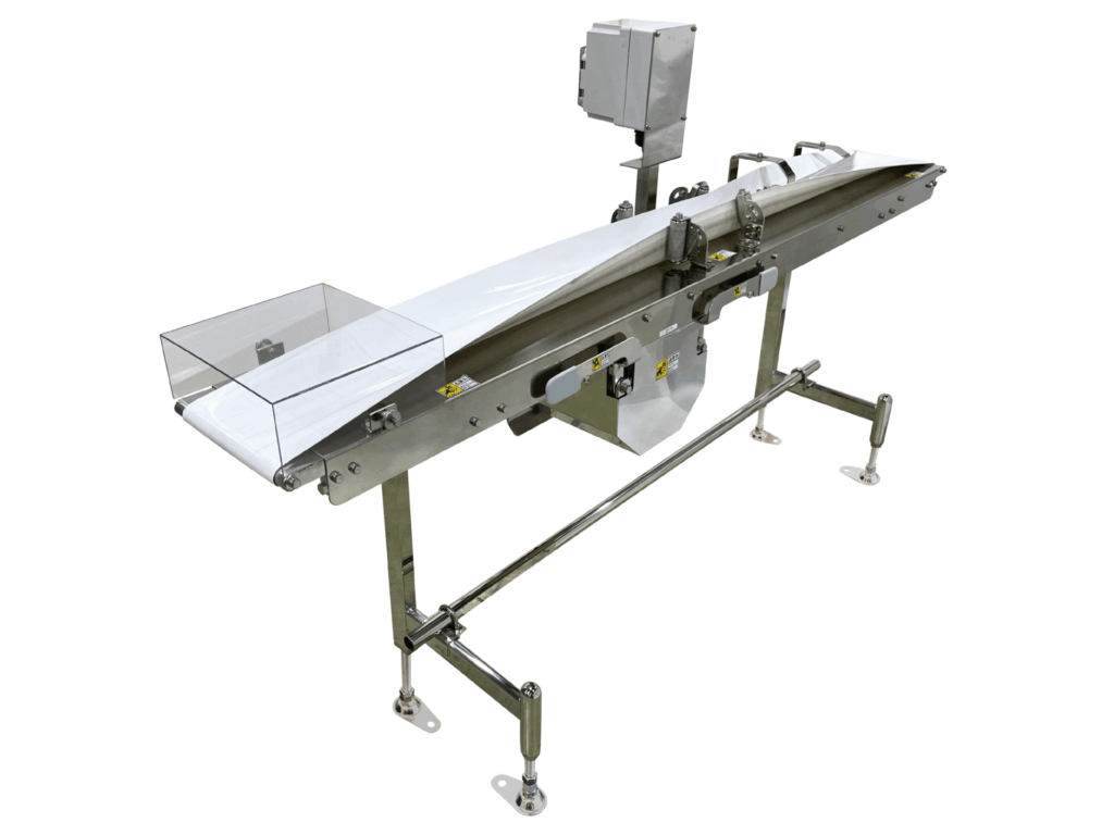 エリアセンサカメラの弱点は一度に片面しか検査できない点です。当社では生産ラインの流れを止めることなくワークの表裏を反転する”反転機構”を備えたコンベヤを取り揃えています。 異物検査やパッケージ内の欠陥検出など、表面検査だけでは判別が難しい場合は、コンベヤの背面から光を当てる”透過検査”が有効です。LEDライトパネル付きコンベヤであれば、製品を下から照らすことで、エリアセンサカメラが上部からその影を撮影、食品内部の異物検査が可能になります。