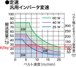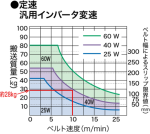 速度は、定速9.4m/minなので横軸9.4から上に見ていくと25Wでは搬送質量17kg程度、40Wでは搬送質量28kgであることが分かります。